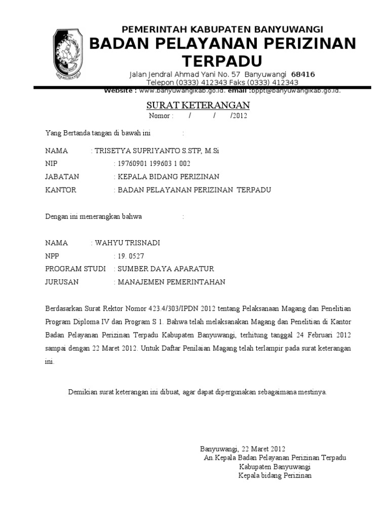 Dokumen ini dapat anda buat sendiri dan bisa dikeluarkan oleh kelurahan di tempat anda tinggal. Surat keterangan tentang orang tua (n4). Magang atau bisa disebut juga dengan kerja praktik merupakan salah satu pengalaman yang besar dan sebaiknya dimiliki ketika masih berada di bangku sekolah atau kuliah. Surat pernyataan bersedia untuk tidak menikah selama menjadi peserta magang. Surat keterangan belum menikah (dari kelurahan).